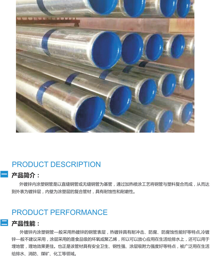 外鍍鋅內(nèi)涂塑鋼管是以直縫鋼管或無縫鋼管為基管,通過加熱噴涂工藝將制管與理科復(fù)合而成,從而達到外表為鍍鋅層,內(nèi)壁為涂塑層的復(fù)合管材,具有耐蝕性和耐磨性。